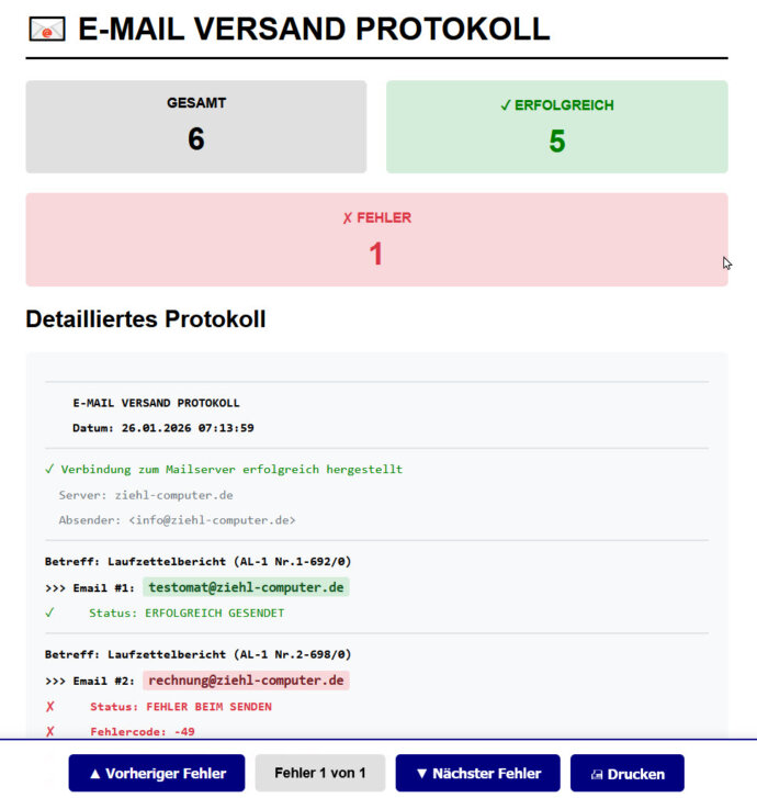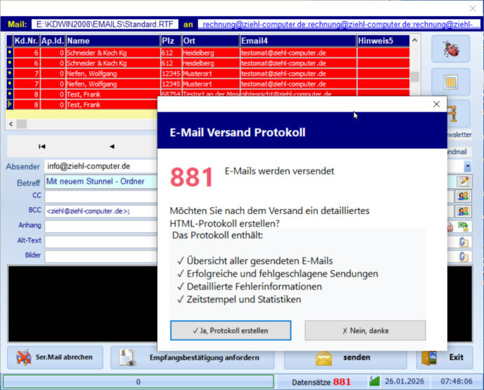 Beim versenden von Emails kann auf Wunsch ein Protokoll erstellt werden.